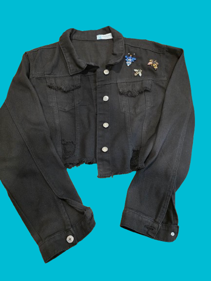 Elevate your casual look with this stylish cropped black denim jacket, featuring frayed hem detailing and eye-catching jewel-encrusted insect brooches for a playful yet chic touch. Designed for versatility, it pairs effortlessly with jeans, skirts, or dresses, making it a year-round wardrobe essential. The tailored fit and classic button-up front give it a timeless denim appeal, while the decorative pins add personality and charm. Perfect for layering during cool days or as a statement piece for your street-style ensemble.